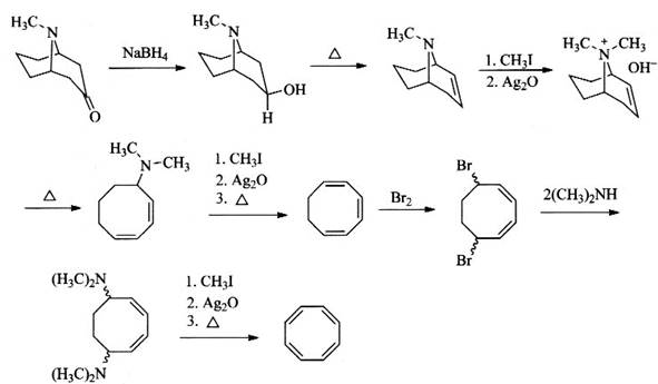 习题15-11 通过文献查阅了解R.Willstätter合成环辛四烯的方法。有人曾质疑他的结果。在不考虑现代表征技术下,提出几种验证其产物为环辛四烯的方法。