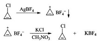 (ii)该化合物不具有芳香性,Cl不能使环直接形成环丙烯正离子。可以采用加入四氟硼酸银的方法,脱去卤素,形成环丙烯正离子。环丙烯正离子具有芳香性。