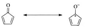 通过共振式可以得到,前两个均具有芳香性,而第三个具有反芳香性,因此环戊二烯酮不太稳定,很容易发生Diels-Alder反应。
