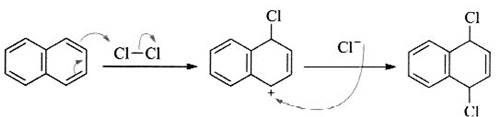 习题15-50 请解释萘与氯气的加成产物为1,4-二氯-1,4-二氢合萘,而不是1,2-二氯-1,2-二氢合萘,并画出其转换的反应机理。