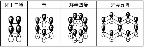 习题15-3 从苯被发现后很多年,化学家一致认为,只要是单双键交替的环状共轭体系,均应该具有和苯环类似的稳定性。这些化合物被命名为annulenes(轮烯)。画出环丁二烯、苯、环辛四烯以及环癸五烯的所有共振式。假定这些分子都是平面的,画出这些分子中碳原子的p轨道以及可能形成的离域p轨道,通过这些结果解释环辛四烯不能形成平面体系的原因。