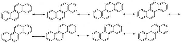 习题15-9 科学研究表明,宇宙中超过20%的碳与稠环芳烃有关,它也可能是生命体形成的起始物。稠环芳烃可能在大爆炸之后不久就像形成了,并广泛地存在于宇宙中。䓛主要存在于煤焦油中,但现在证明䓛也存在于宇宙中。画出它的Lewis结构式,以及所有的共振式。