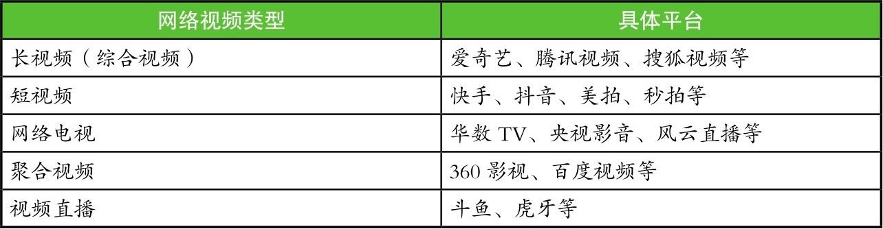 按照网络视频平台运营商的特点分类,可以将网络视频分为5种类型,即长视频(综合视频)、短视频、网络电视、聚合视频和视频直播,如表1-1所示。目前,网络视频的两大支柱为长视频(综合视频)和短视频。