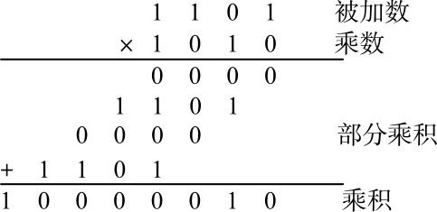 从该例可知其乘法运算过程和十进制的乘法运算过程非常一致,仅仅是换用了二进制的加法和乘法规则,计算更为简洁。