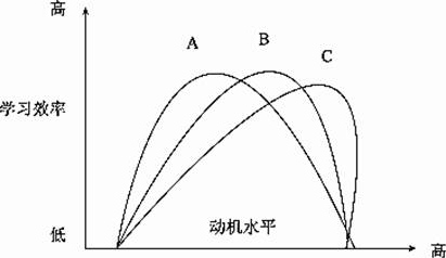(3)学习动机的最佳水平不是固定的,依据任务的不同性质会有所改变。在完成简单的任务中,学习动机强度高,学习效率可以达到最佳水平,如图中曲线C所示;在完成难度适中的任务中,中等的学习动机强度的学习效率最高,如图中曲线B所示;在完成复杂和困难的任务中,偏低学习动机强度下的学习效率最佳,如图曲线A所示。