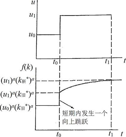 (2)假设资本利用率在t 0 时点上从u 0 上升到u 1 ,然而在这一瞬间资本利用率的改变并不会影响稳态下的人均资本存量,所以资本利用率上升的即刻影响是人均产出y由y=(u 0 ) a (k 旧 * ) a 变为y=(u 1 ) a (k 旧 * ) a 。然而随着时间的推移,人均资本存量会上升,最终重新均衡,之后人均资本存量为k 新 * ,重新达到稳态后的人均产出为y=(u 1 ) a (k 新 * ) a 。