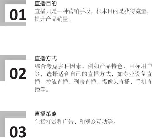 通常来说,事前分析工作主要围绕直播目的、直播方式和直播策略三块内容来进行。