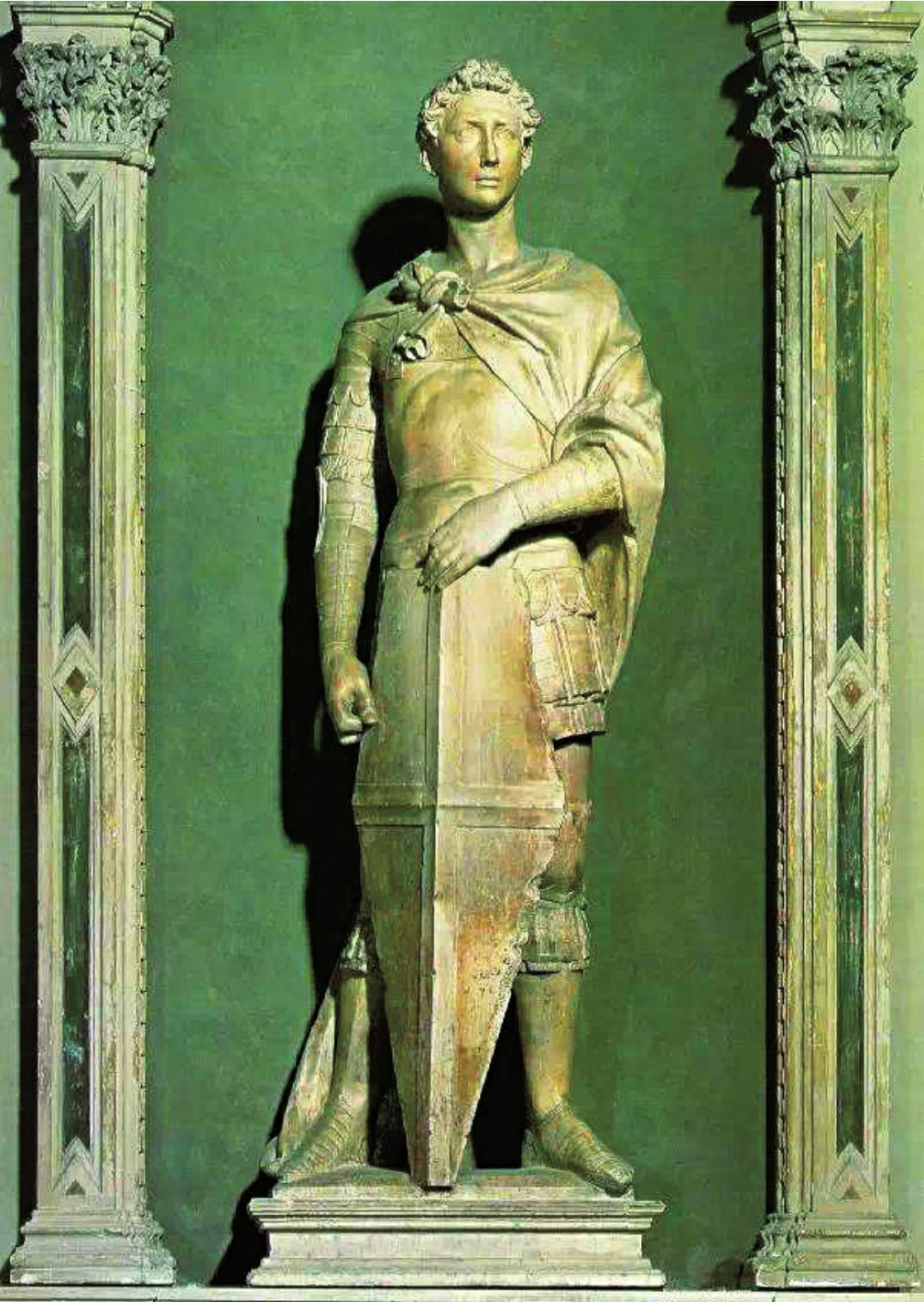 然而它的美还不在此。圣乔治固然是一个美少年,但他也是一个勇武的兵士。故陶拿丹罗更要表现他的勇。表现勇并不在于一个确切的动作,而尤在乎雕像的各小部分。肉体应得传达灵魂。罗丹(Rodin)有言:“一个躯干与四肢真是多么无穷!我们可以借此叙述多少事情!”这里,圣乔治满身都是勇气,他全体的紧张,僵直的两腿,坚执盾柄的手,以至他的目光,他的脸部的线条,无一不表现他严重沉着的力。但整个雕像保留了古雕塑的宁静的风格。