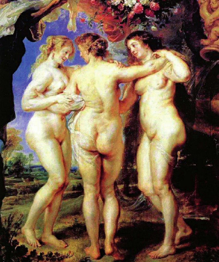 现在试将《春》的各组人物加以分别的研究:第一是三女神,这是一组包围在烟雾似的氛围中的仙女,她们的清新飘逸的丰姿,在林木的绿翳中显露出来。我们只要把她们和拉斐尔、吕朋斯 (Rubens,鲁本斯) 以至十八世纪法国画家们所描绘的“三女神”作一比较,即可见鲍氏之作,更近于古代的、幻忽超越的、非物质的精神。她们的婀娜多姿的妩媚,在高举的手臂,伸张的手指,微倾的头颅中格外明显地表露出来。