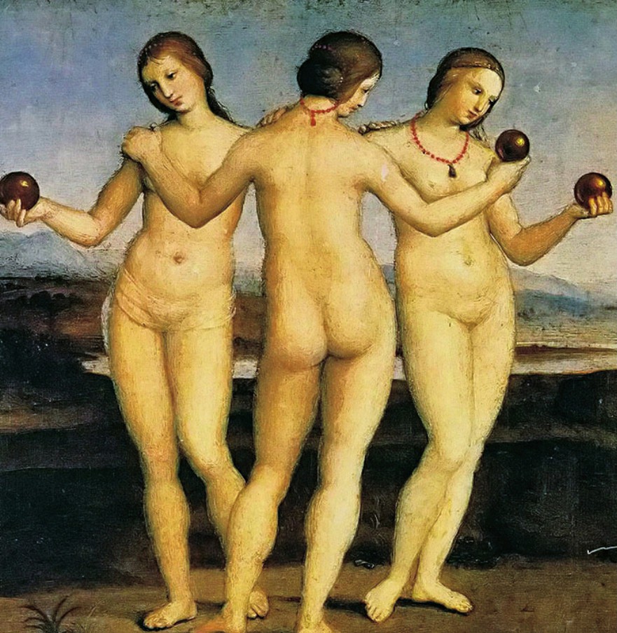 可是在大体上,“三女神”并无拉斐尔的富丽与柔和,线条也许太生硬了些,左方的两个女神的姿势太相像。然这些稚拙反给予画面以清新的、天真的情趣,为在更成熟的作品中所找不到的。