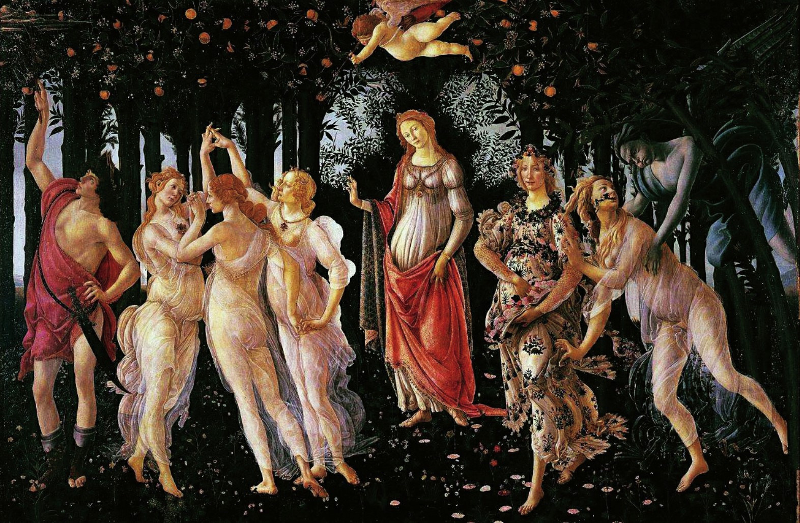 然而这幅《春》的构图,并没像古典作品那般谨严,它并无主要人物为全画之主脑,也没有巧妙地安排次要人物作为衬托。在图中的许多女神之中,很难指出哪一个是主角;是维纳斯?是春之女神?还是三女神?雄辩之神那种旋转着背的神态,又与其余女神有何关系?