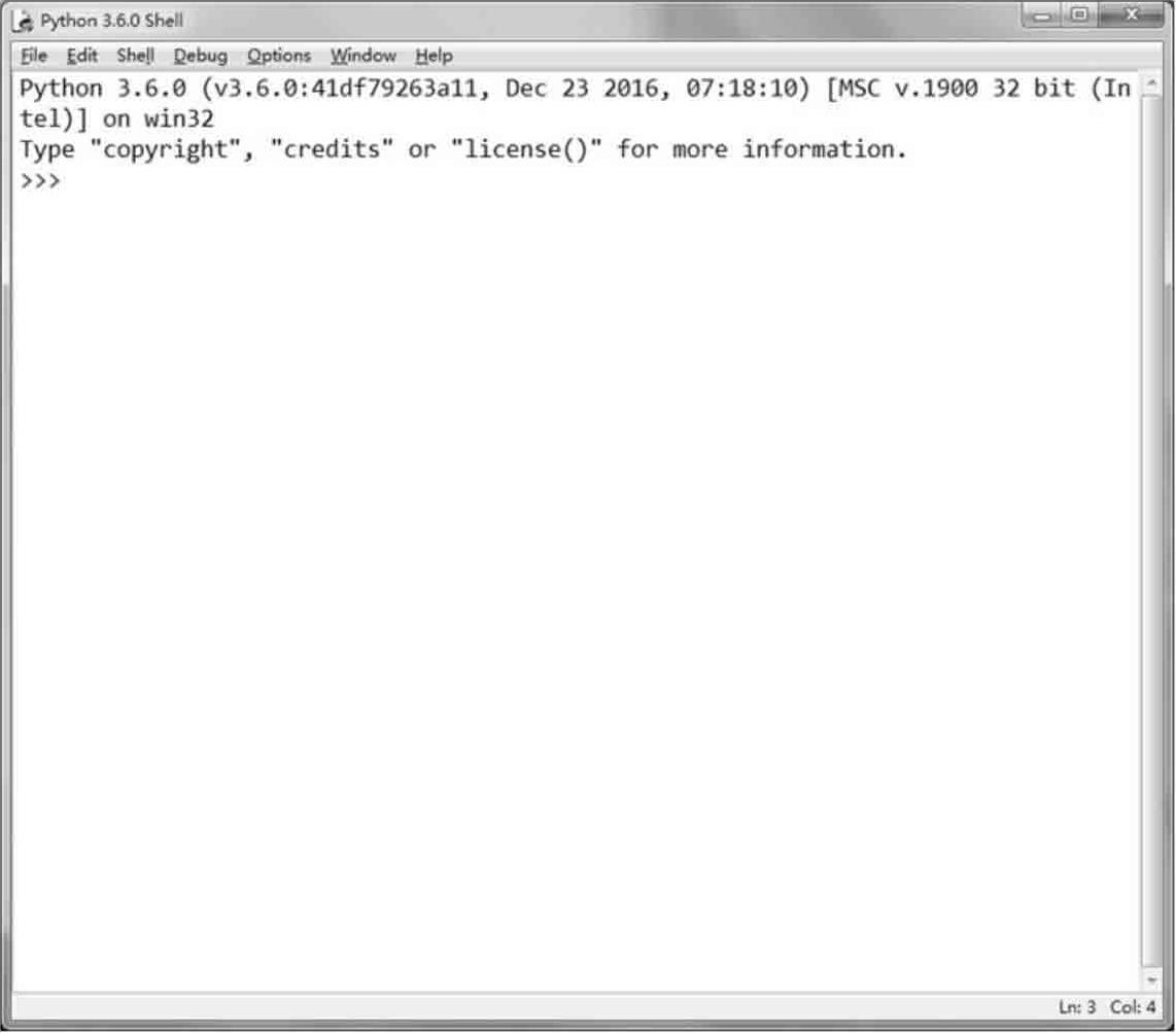 Python官方网站上提供的Python IDLE文件为英文版,初始运行界面如图0-1所示(Shell窗口)。