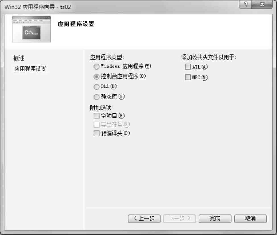 如图0-5所示,在弹出的“Win32应用程序向导-ts02”对话框中,取消选中“预编译头”复选框,单击“完成”按钮。
