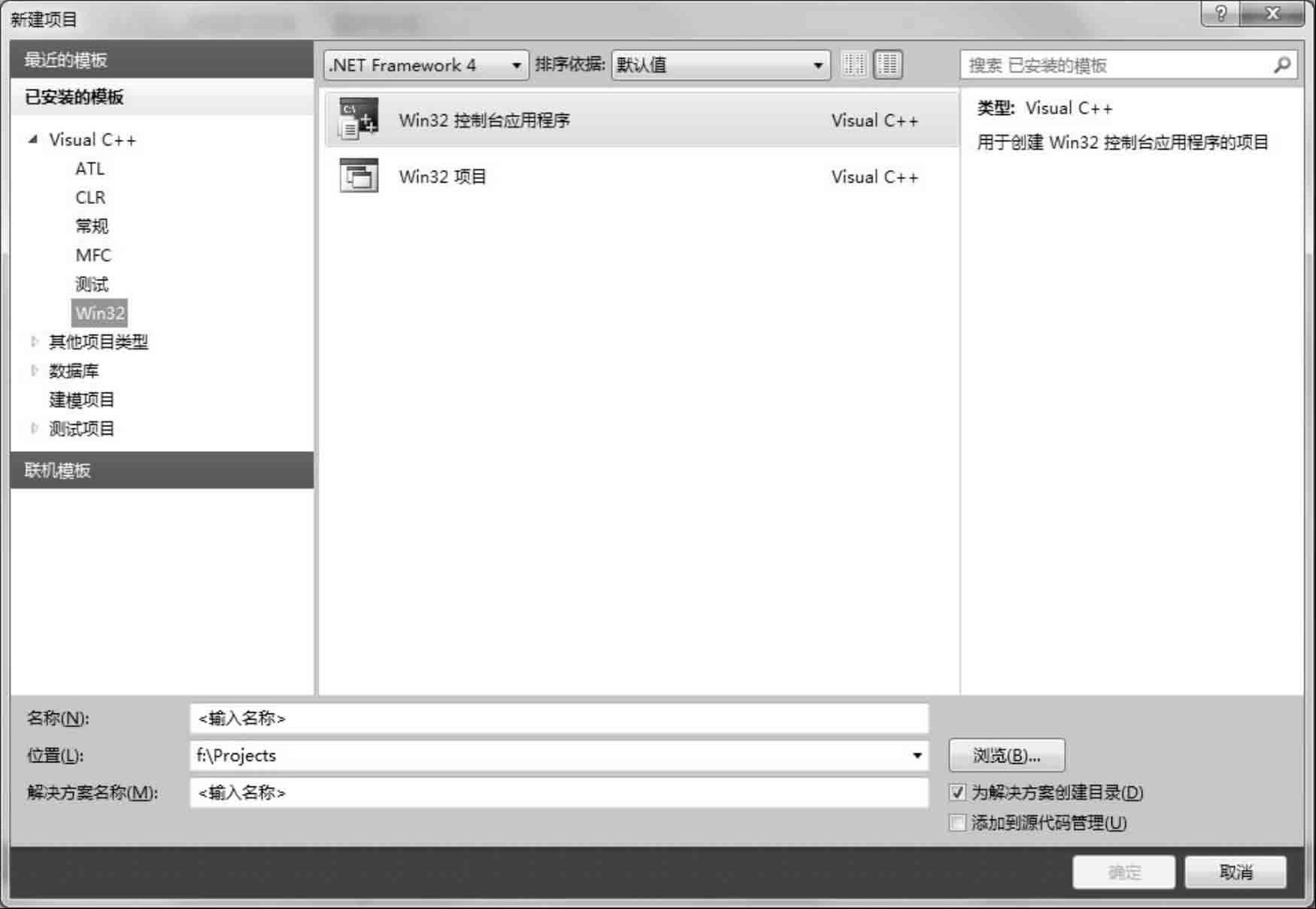 在左侧模板栏中选择Visual C++下的Win32,中间部分选择“Win32控制台应用程序”选项,在下方输入自拟的项目名称,单击“确定”按钮。
