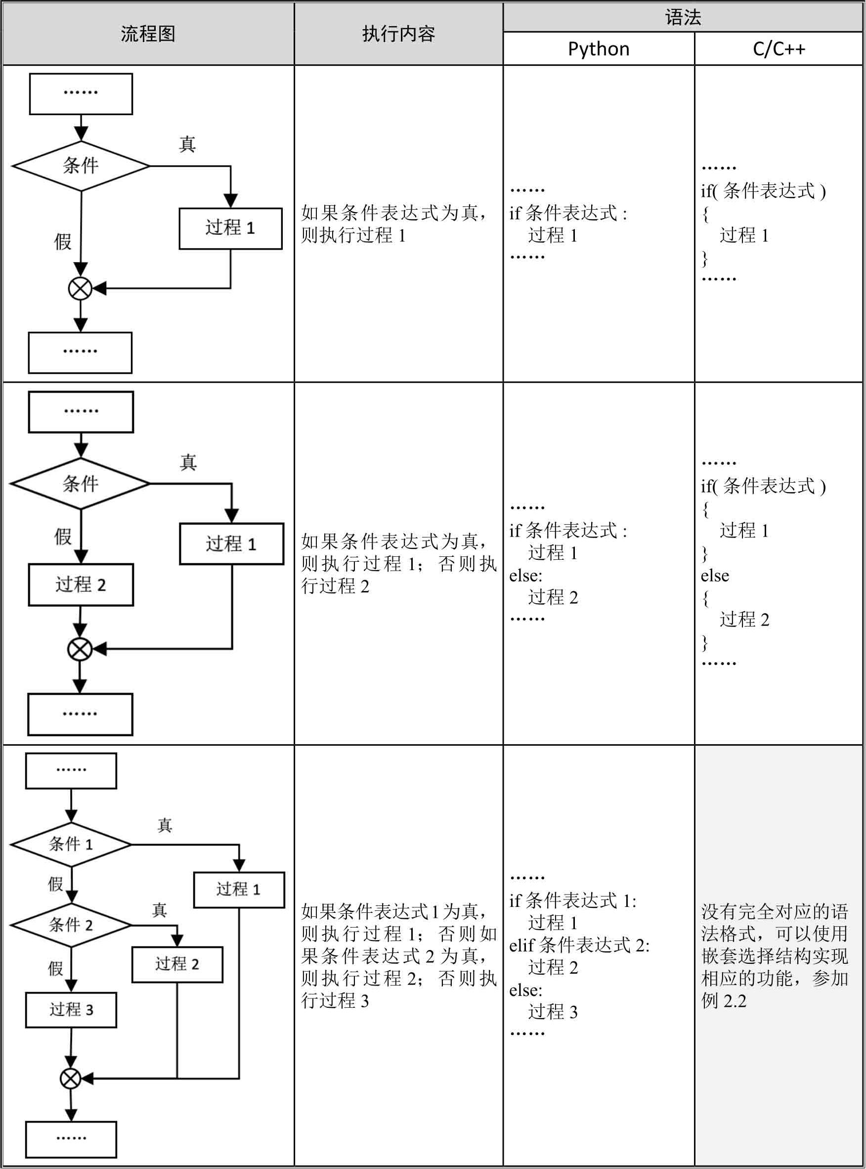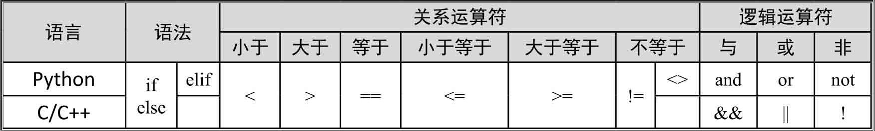 本章学习了Python和C/C++中选择结构的基本用法,其使用方法对例如下表所示。