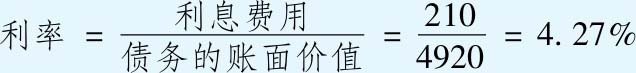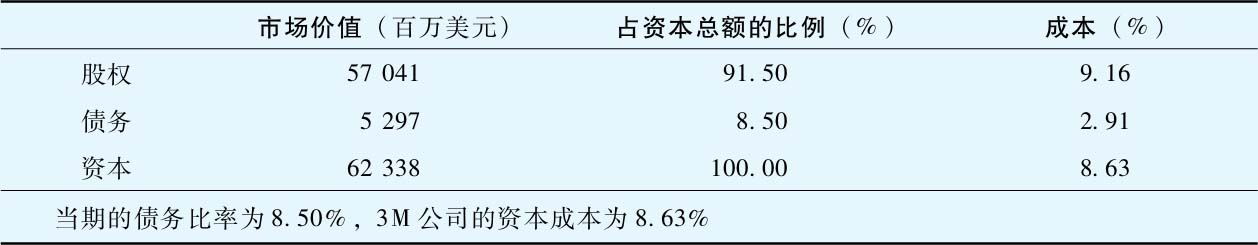 我们给3M公司赋予的信用等级为AAA,违约利差为0.75%。将这个利差与3年期国债利率3.72%叠加,我们可以得到税前的债务成本为4.49%。与此相反,将2007年的利息支出除以债务的账面价值,我们可以得到账面利率: