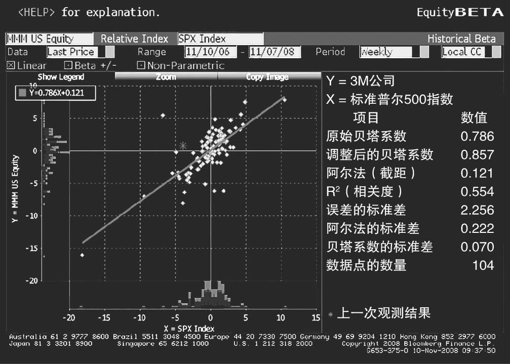 由于3M公司是一家历史悠久的公开上市公司,因此,我们可以使用公司的历史股价对市场指数进行回归,从而得到回归贝塔系数。图2-8为3M公司相对于标准普尔500指数的回归贝塔,即采用2年期的周收益率对标准普尔500指数进行回归。可以看到,回归(原始)贝塔系数是0.79;调整后是0.86,为原始贝塔向市场平均值1回归的结果。