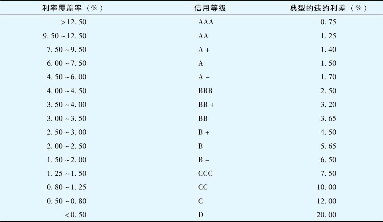 ·如果公司未取得信用评级,而且有尚未偿还的债务(银行贷款),那么我们就可以根据其财务比率估计这家公司的“综合”评级。在估计“综合”评级时,一种简单但有效的方法就是完全以公司的利息覆盖率(息税前利润/利息支出)为基础;与较低的利息覆盖率相比,较高的利息覆盖率对应的信用评级也相对较高。