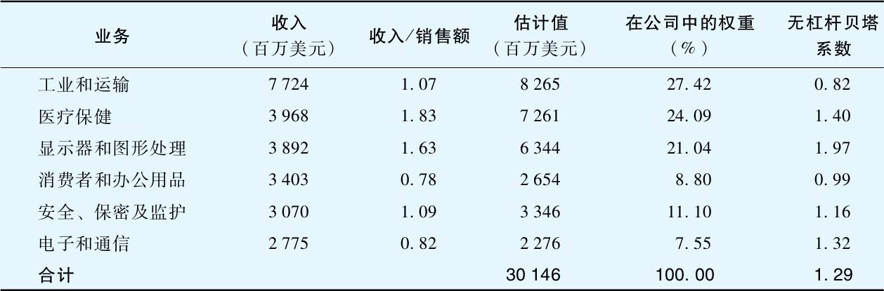 为得到一个有明显差别的结果,我们可以将3M公司分解为个别业务,并对每项业务的贝塔系数进行加权平均,从而得到3M的另一个贝塔系数估计值(参见表2-1)。