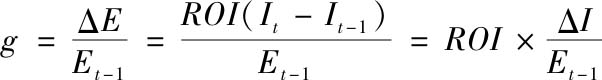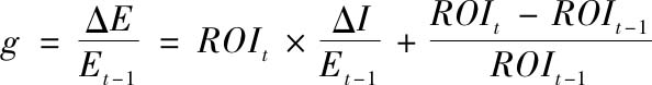 上述公式基于这样一个假设:第t期新增投资的收益率等于该期现有投资的收益率。事实上,我们可以让上述公式进一步回归现实。假如我们让新增投资的收益率(ROI 新,t )不等于现有资产的收益率(ROI 现有,t ),那么,对预期增长率就可以做如下表述: