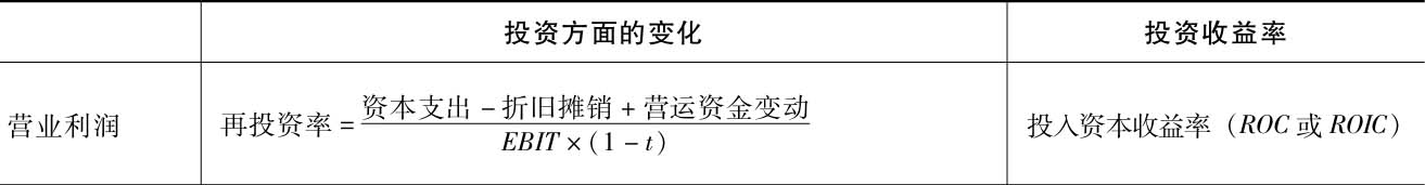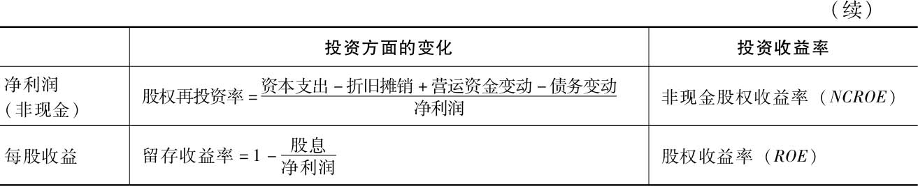 来自新增投资的增长 虽然投资和投资收益率属于最常见的术语,但如何定义它们还取决于我们强调的是股权收益还是营业利润。在考虑股权收益时,我们强调的是来自投资的股权部分,其收益率对应于股权收益率。但是在考虑营业利润时,我们关注的则是总投资,因此,收益率就对应于资本收益率。在本章开始时介绍的现金流定义中,我们将投资变化确定为再投资,而对再投资的衡量标准则是变化的,依赖于被折现的现金流。在股息折扣模型中,再投资被定义为留存收益(所有没有作为股息支付的收益)。而在股权(公司)自由现金流模型中,再投资则是按股权再投资率(再投资率)定义的。