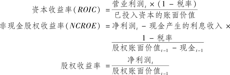采用投资和投资回报率的会计指标是传统的做法。因此,股权账面价值、已投入资本的账面价值和会计利润面值均可用于计算资本收益率和股权收率益: