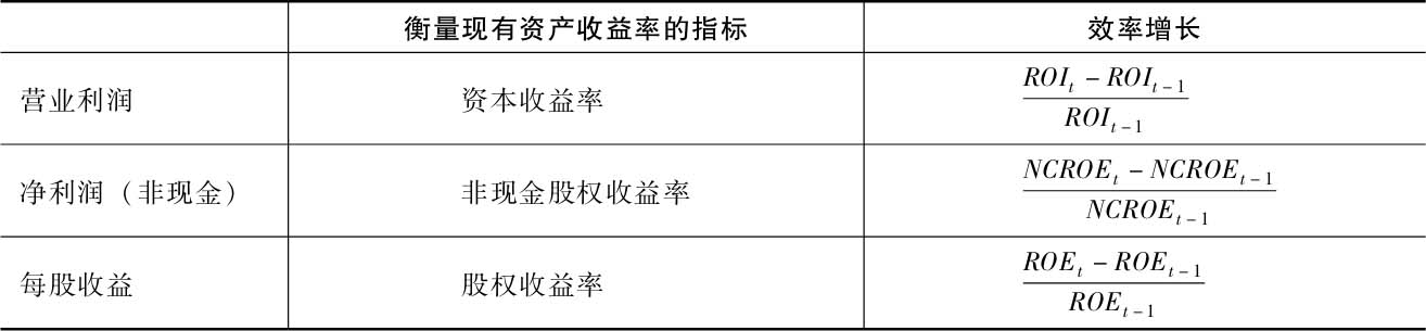 效率增长 对很多鲜有投资机会的成熟型企业来说,新投资带来的增长潜力是有限的。这些公司很难维持较高的再投资率,因而也难以通过再投资取得较高的资本收益率。但如果能提高现有资产的收益率,这些公司依旧可以维持可观的增长率。相反,如果现有资产的收益率下降,就有可能导致收益增长率下降。因此,如采用不同的收益指标,我们可以将效率增长表述为表2-6所示的形式。