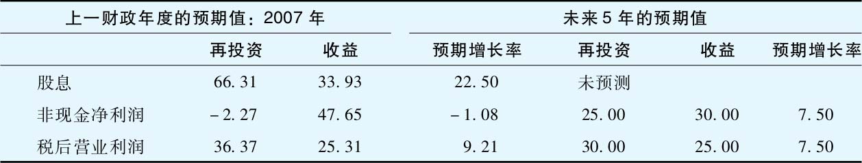 但是从基本面上来看,考虑到目前原本已很高的资本收益率和股权收益率,3M公司似乎不大可能在效率增长方面大展宏图,但关键就在于对新资产的再投资。这种再投资与新增投资的高资本收益率相互叠加,共同带来了可观的增长率。表2-7采用我们为3M公司估计的再投资及收益特征,总结了股息、非现金净利润和税后营业利润的增长情况。