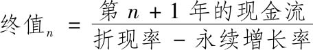 在估计期结束时,如果我们认为公司是持续经营的,那么我们就可以假设,现金流在此后以恒定速度继续增长,并在此基础上估计这个持续经营企业的价值。如果假设公司会永远存续下去,在永续增长模型中,就可以利用一个简单的现值计算公式得到终值: