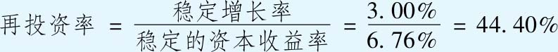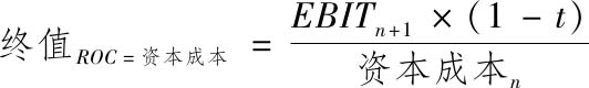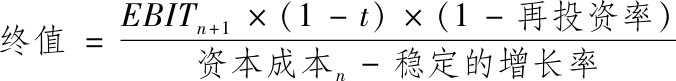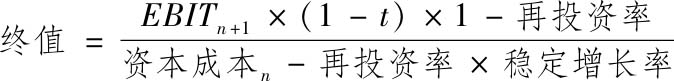 由于再投资率的提高,会导致现金流的损失抵消部分或全部由增长率提高带来的收益。稳定增长率的提高到底会增加还是减少价值,完全取决于我们对超额收益的假设。如果资本收益率高于稳定增长期的资本成本,那么提高稳定增长率就会增加价值。如果资本收益率等于稳定增长率,那么提高稳定增长率对价值没有影响。如果用稳定增长率代替之前的再投资率,我们就可以得到: