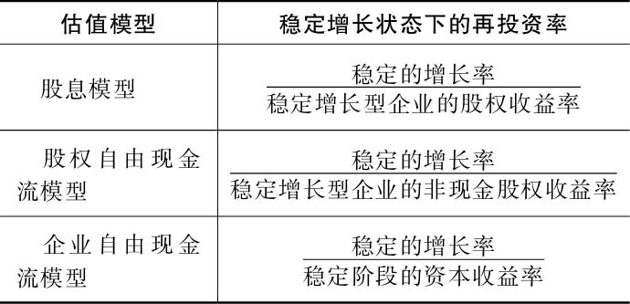 · 再投资和超额利润假设 :稳定增长型企业的再投资往往少于快速增长企业。关键在于,我们既要掌握低增长对再投资的影响,又要确保公司以足够的再投资维持最终阶段的稳定增长。考虑到增长率、再投资率以及前面“增长的分解”部分中确定的收益率之间的关系,我们可以得到与表2-8预期增长率保持一致的再投资率。