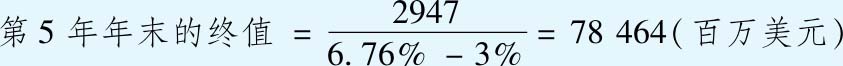 在第5年结束时,我们假设,3M公司将成为一家稳定增长型企业,并按每年3%的速度永续增长。在其他参数(44.4%的再投资率和6.76%的资金成本)保持不变的情况下,我们对案例2-6中的3M公司在稳定增长状态下进行估计,并由此得到第6年的FCFF和公司的终值: