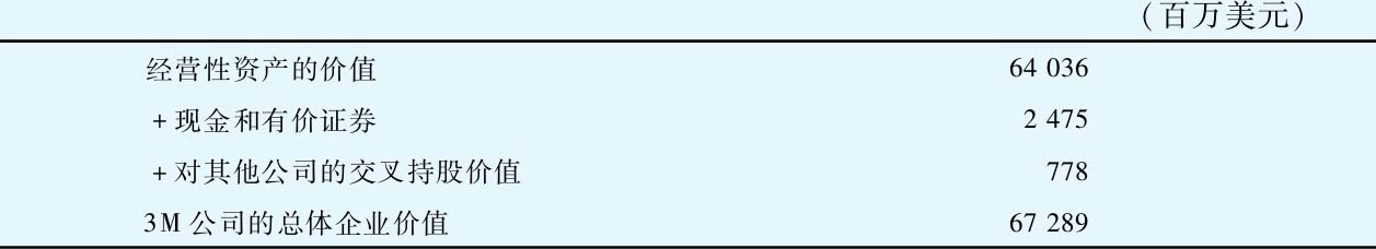 再加上现有现金余额2475(百万美元)、对其他公司所持少数股权的价值778(百万美元),我们可以得到3M公司的总价值为67 289(百万美元)。