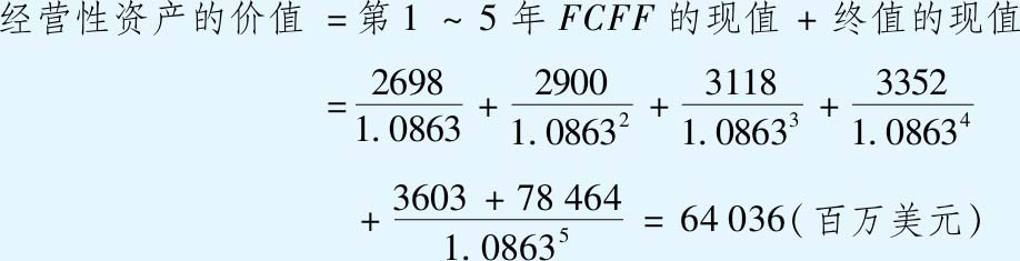 继续使用前5年8.63%的资本成本,我们对未来5年的现金流和终值进行折现,从而得到经营性资产的估值为607.19亿美元。