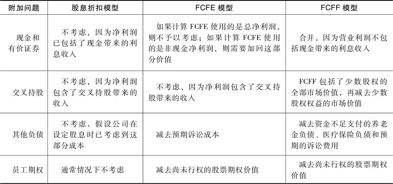 到此为止,我们已经讨论了折现现金流估值模型的4个基本变量——现金流、折现率、增长率和终值。通过以风险调整利率对现金流折现,我们所得到的现值应该是价值的估计数。但是要从这一数字中得到我们愿意支付的每股对价,显然还需要考虑一下其他要素: