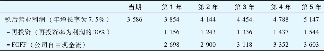 在之前的示例中,我们估计了3M的估值变量——从现有现金流(案例2-1),到资本成本(案例2-4),再到终值的计算(案例2-6)。首先,我们采用了7.5%的预期增长率,并将前5年的再投资率估计为30%,在此基础上,我们得到每年的预期公司自由现金流(FCFF),如表2-11所示。
