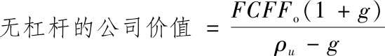 其中,FCFF o 是公司的当期税后经营现金流,ρ u 为股权的无杠杆成本,g为预期增长率。在更为常见的情况下,可以采用任何我们认为合理的增长假设对公司进行估值。估值所需要的参数包括预期现金流、增长率和无杠杆的股权成本。