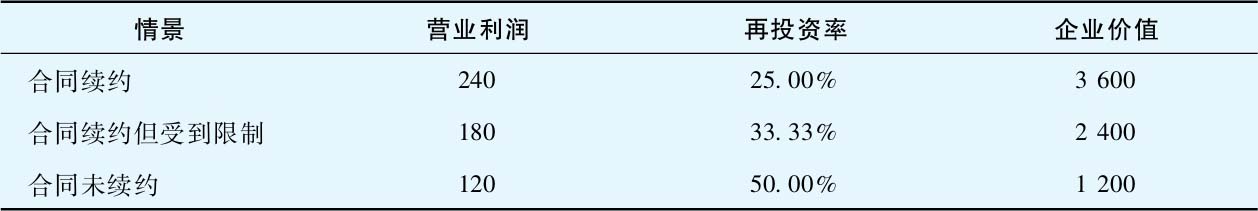 使用表3-1中的预期税后营业利润估计值和表3-2中的再投资率,我们估计出每种情景下的企业价值为: