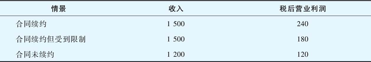此时,你对公司的估值将在很大程度上取决于是否与沃尔玛续约。因此,根据合同的续约情况,我们得到对明年的预计收入和税后营业利润的三组估计数字。表3-1汇总了每种情景下的估计值(金额单位为百万美元)。