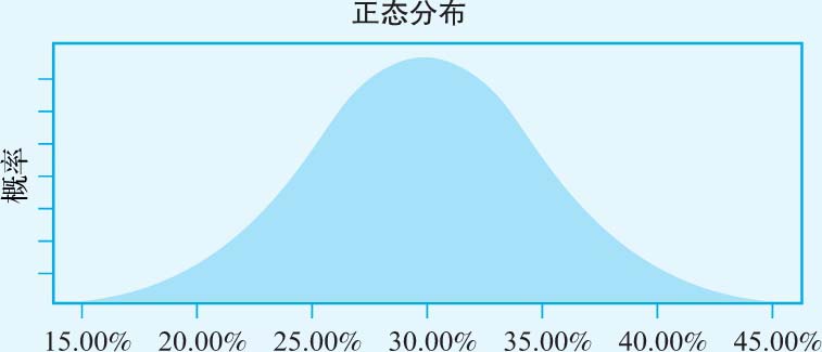 · 再投资率 :在基本情境下的估值中,我们假设基于历史记录,3M公司将在未来5年内保持30%的再投资率,但公司可能会提高或降低再投资率。以3M公司以往的再投资率标准差为标准,我们假设公司的再投资率服从正态分布,预期值为30%,标准差为5%,如图3-11所示。