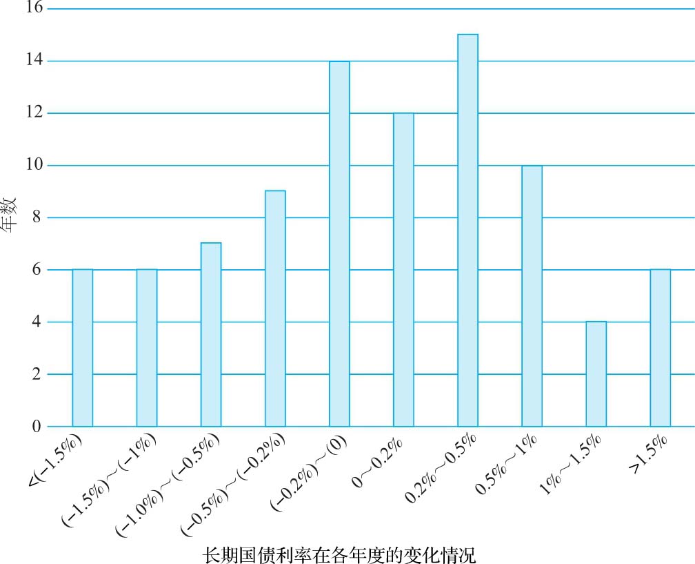 · 历史数据 :对拥有较长历史且历史数据较为可靠的变量,我们可以使用历史数据建立该变量的分布区间。例如,假设我们试图建立长期国债利率预期变化的概率分布(用作投资分析的输入参数)。按照国债利率在1928~2016年的各年度变化情况,我们可以使用如图3-6所示的柱状图反映国债利率未来变化的分布区间。