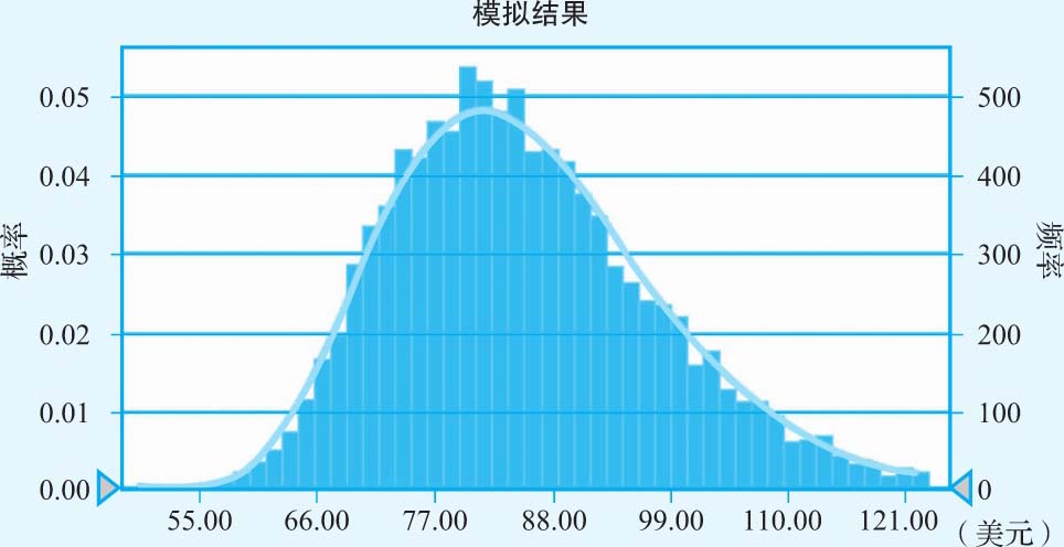 有了这些输入参数,我们就可以对上述指定的参数进行模拟,从而估算3M公司的每股价值,图3-14显示了对我们所得到的分布进行模拟的结果(合计进行了10 000次模拟)。