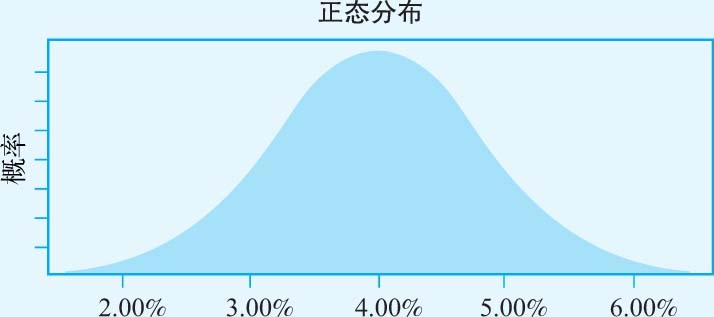 · 股权风险溢价 :在基本情境下的估值中,我们使用了4%的股权风险溢价,它是标准普尔500指数在1960~2007年内在溢价的历史平均值,但这个估计值本身即存在一定的误差。因此,我们假设3M公司的股权风险溢价服从正态分布,预期值为4%,标准差为0.80%,如图3-8所示。