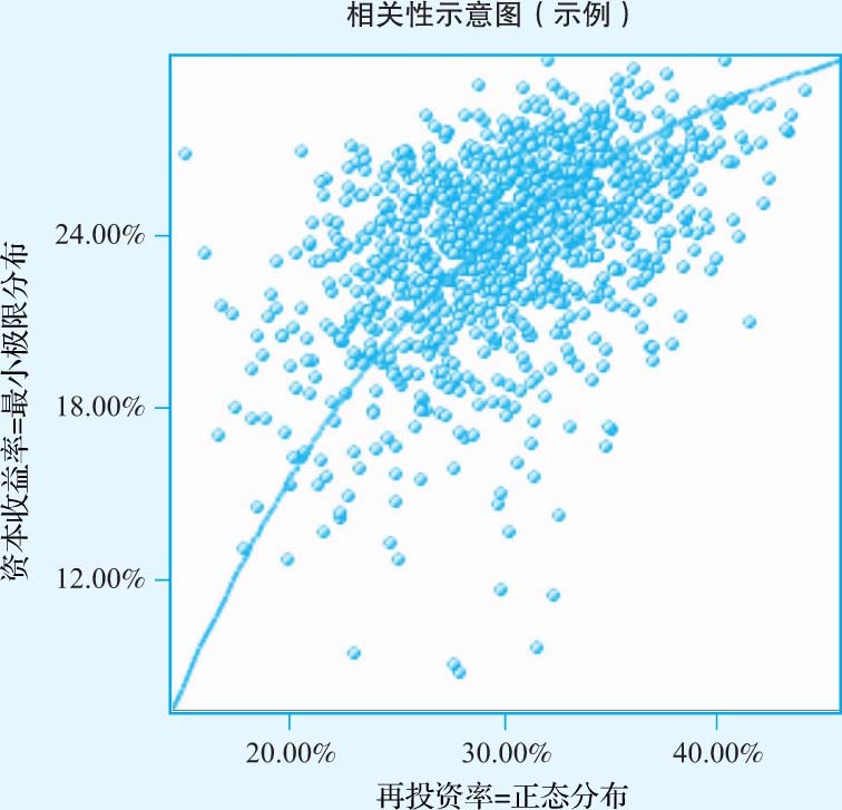 然而,再投资率极有可能是资本收益率的函数,如果资本收益率很高,那么再投资率也会很高。为此,我们假设两者之间的相关系数为0.40,也体现资本收益率与再投资率之间的这种联动。这就形成了如图3-12所示的散点图。