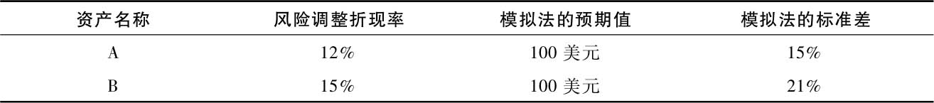 当我们以模拟估值结果的标准差用作投资或资产的风险考量指标并以此为基础制定决策时,上述的例外情况就出现了。在例外情况下,使用风险调整折现会导致风险被重复计量。不妨考虑一个简单的例子。假设你需要在两笔投资中做出选择,且这两笔投资分别使用模拟法和风险调整贴现率进行估值。表3-5归集了两种估值方法的结论。