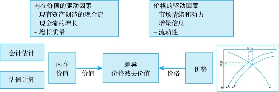 在折现现金流估值法与相对估值法之间,存在着重大的原则性差异。在折现现金流估值法中,我们试图根据资产在未来创造现金流的能力来估算其内在价值。而在相对估值法中,我们要根据市场为类似资产支付的价格来判断目标资产的价值。如果市场对资产的定价在总体上是正确的,那么折现现金流和相对估值的结果有可能会趋同。但如果市场对一组资产或整个板块出现系统地高估或低估,那么折现现金流估值法的结果就有可能偏离相对估值法。体验价值和定价过程之间差别的最简单的办法就是借助于图片。我们在图4-1中比较了决定价值和价格的相关因素。