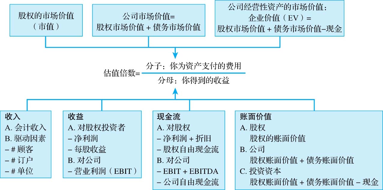 在与相同投资进行比较时,我们可以比较这些投资的市场价格。因此,“蒂凡尼”牌灯具的价格可以和市场上相同灯具的买卖价格进行比较。但是要比较不完全相同的资产,显然就没那么简单了。如果我们需要比较同一地点的两座不同面积的建筑物价格,那么除非通过计算每平方英尺的价格来控制尺寸差异,否则面积较小的建筑物似乎应该更便宜。但是要比较不同公司公开交易的股票,问题则要复杂得多,毕竟每股价格取决于公司的股权价值和流通股的数量。因此,如果通过股票分割将流通股的数量增加一倍,那么股价将降低到原来的一半左右。为了比较市场中“相似”公司的价值,我们需要以某种方式对价值进行标准化处理,让它们按某个共同的变量进行缩放。一般而言,我们可以将价值按公司创造的收益、公司本身的账面价值或重置价值、公司创造的收入或同行业企业的某个特定指标进行标准化。为了解企业在估值时到底需要多少变量以得到标准化价格,我们不妨考虑一下图4-2,看看如何选择它们的分子及分母。