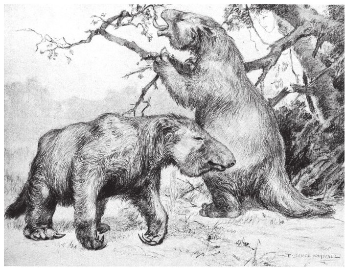 居维叶还收到了一份素描图(那年头没有照片,博物学家都是素描的高手)。这份素描上画的化石是在南美的布宜诺斯艾利斯的河岸上新发现的。骨架运到了马德里,拼起来以后非常巨大。长4米,高2米。这是一种巨大的动物。居维叶立刻判断出来,这种动物跟南美丛林里的树懒很相似。没错,就是《疯狂动物城》里面的那种慢得叫人急死的树懒。只是这种巨大的动物比树懒放大了1000倍。居维叶将它命名为大地懒,其拉丁文学名的意思就是“巨大的野兽”。他起初以为,大地懒也会像今天的树懒一样爬到树上,后来一看这个体型,算了吧,这东西能爬树才怪呢。最后居维叶把大地懒复原为一种身躯粗大、四足行走、身披长毛的巨兽,偶尔还能用两条后腿支撑立起身子。杰斐逊总统收藏的“巨爪”其实就是大地懒的。今天看来,居维叶在200多年前对大地懒的复原基本靠谱,不服不行啊,太厉害了!