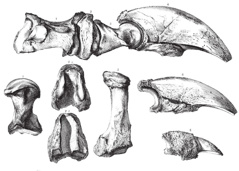 1796年7月,托马斯·杰斐逊收到了斯图尔特上校送来的几个化石,那是工人们在弗吉尼亚的一个山洞挖掘硝石的时候发现的。骨头倒是挖出来一大堆,他们一顿乱拼,整个骨架相当地怪异,三个大爪子倒是很明显。他后来在费城的哲学会议上宣读了一份论文,称这个化石为“巨爪”。它比狮子、老虎的爪子还要大三倍,显然不是布丰所说的“退化的动物”。你看,杰斐逊的民族自豪感还挺强烈。在此以前,美国在纽约和肯塔基已经发掘出了古代大象的化石,明显比现在的大象要大好几圈。这说明美洲的动物并不低人一等。