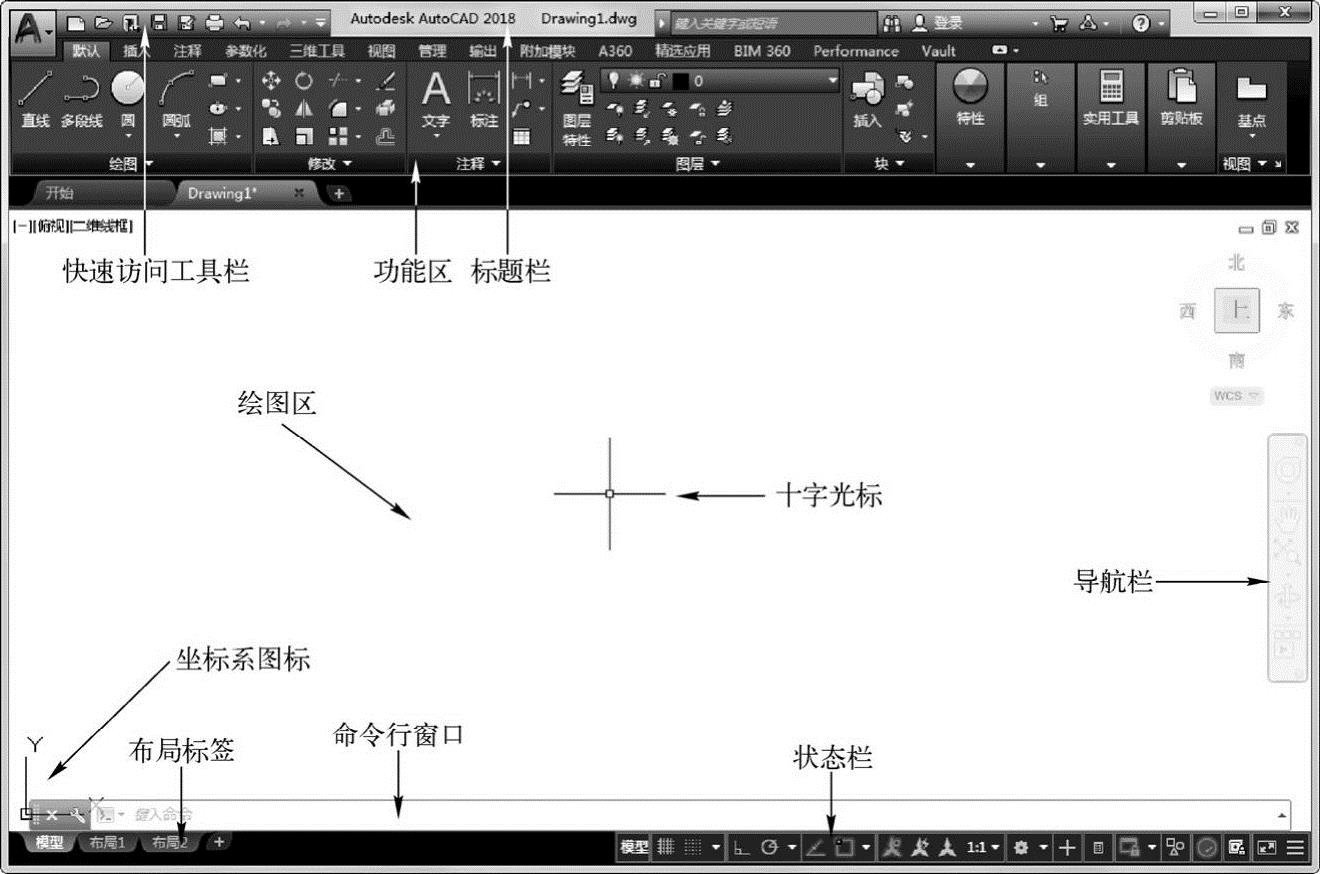 AutoCAD操作界面包括标题栏、绘图区、十字光标、坐标系图标、命令行窗口、状态栏、布局标签、导航栏、快速访问工具栏、功能区等。